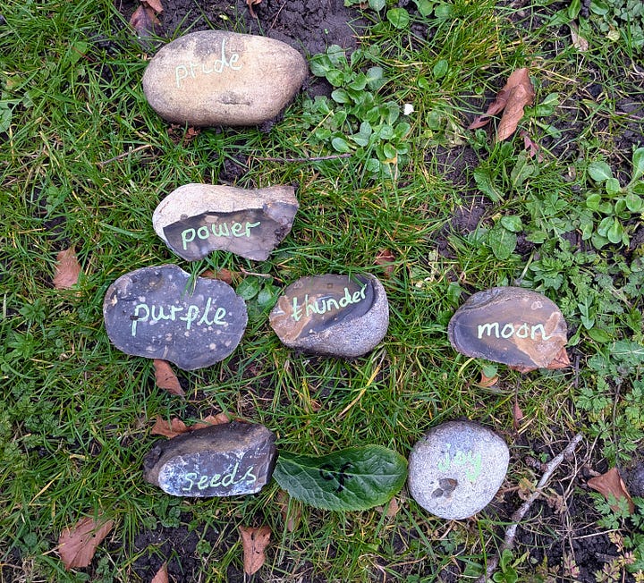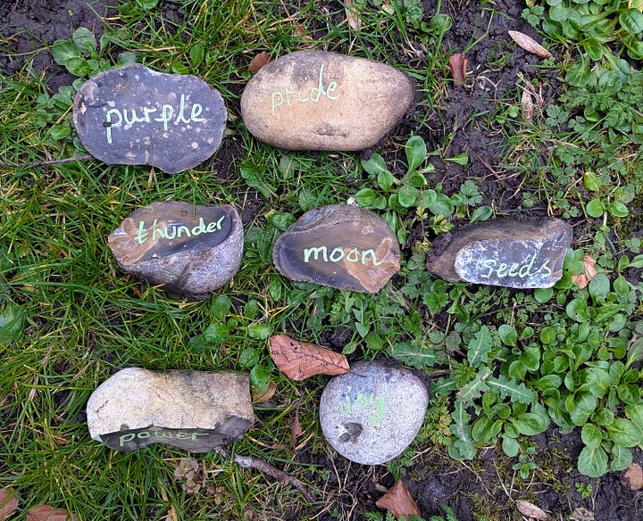 · POEM INSPIRATION: Each child picks two pebbles. These words then become either the title, theme or inspiration for writing a poem.