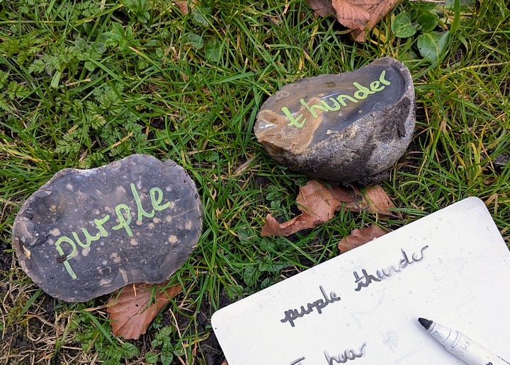 · PEBBLE POEMS: Pick a selection of pebbles (7-12 works well) and then as a group children play around with arranging them in different orders until they are happy with the poem they have. This can be taken further by allowing them to add their own words between the pebbles – I like to use leaves to represent the added words.